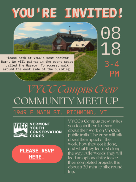 VYCC’s Campus Crew invites you to join them to learn about their work on VYCC’s public trails. The crew will talk about the impact of their work, how they got it done, and what they learned along the way. Afterwards, they will lead an optional hike to see their completed projects. It is about a 30-minute hike round trip.