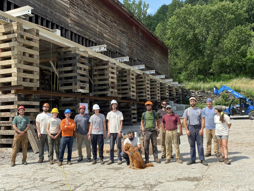 Pictured here, Timber Framers Guild volunteers with Eliot Lothrop and Dan Lee.